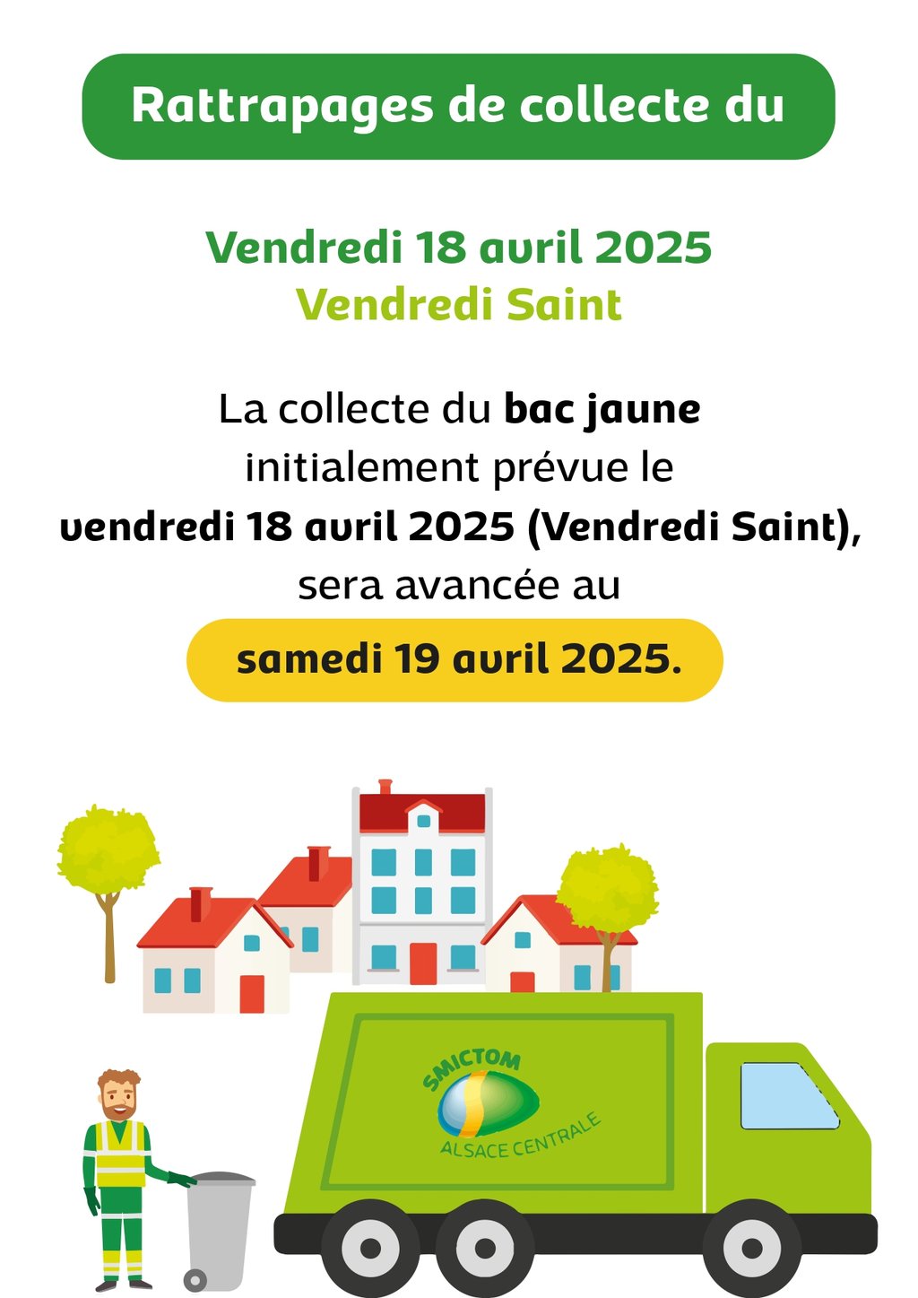 Le vendredi 18 AVRIL 2025 étant férié, la collecte des bacs jaunes n’aura pas lieu ce jour-là comme habituellement, et sera reportée au SAMEDI 19 AVRIL 2025.
