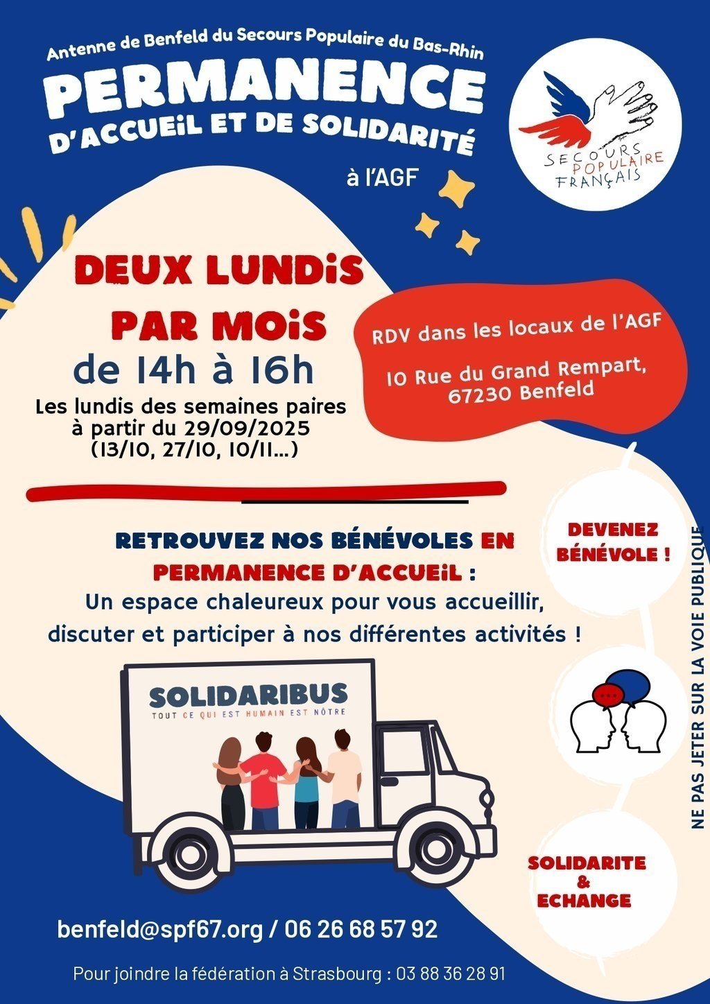 L’antenne benfeldoise du Secours populaire du Bas-Rhin s’installe peu à peu ! Une permanence d’accueil et de solidarité est proposée tous les quinze jours :