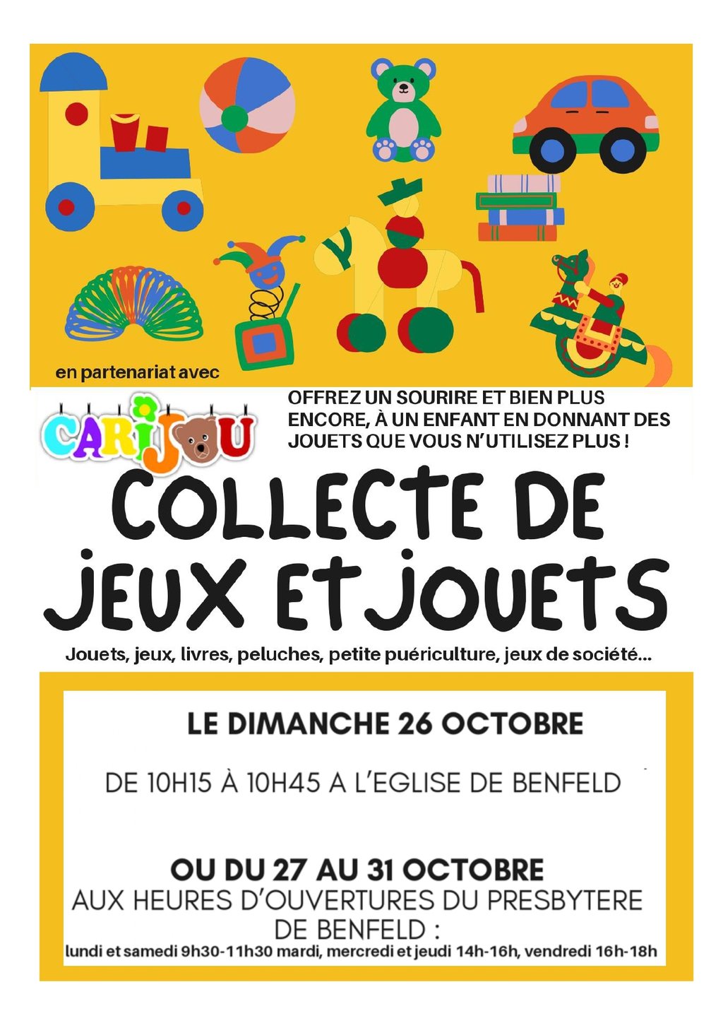 Participez Ă la collecte organisĂ©e Ă Benfeld au profit de CARIJOU (Caritas), qui Ćuvre pour offrir des jouets revalorisĂ©s Ă petits prix aux familles.