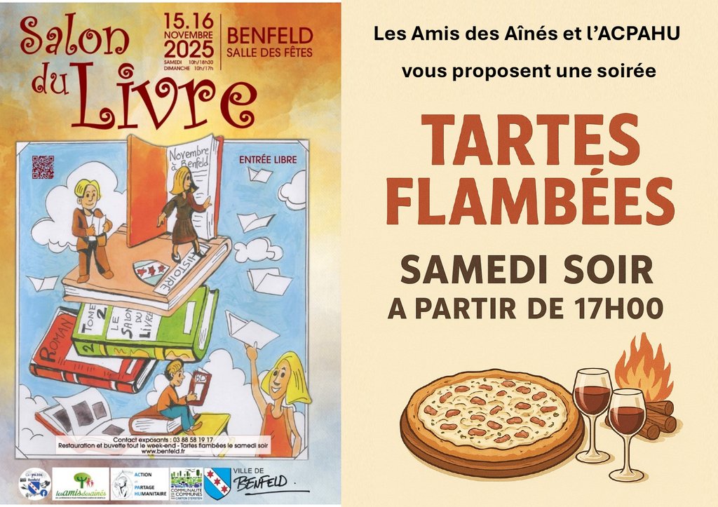 Dans le cadre de la 2ᵉ édition du Salon du Livre de Benfeld, les associations Les Amis des Aînés et ACPAHU vous invitent à partager un moment de convivialité lors d’une soirée tartes flambées.