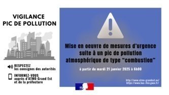 Le dispositif de surveillance d’ATMO Grand Est a déclenché une procédure d’alerte à la pollution atmosphérique pour le département du Bas-Rhin en raison d’une concentration élevée de particules fines issues de la combustion (chauffage et/ou véhicules).