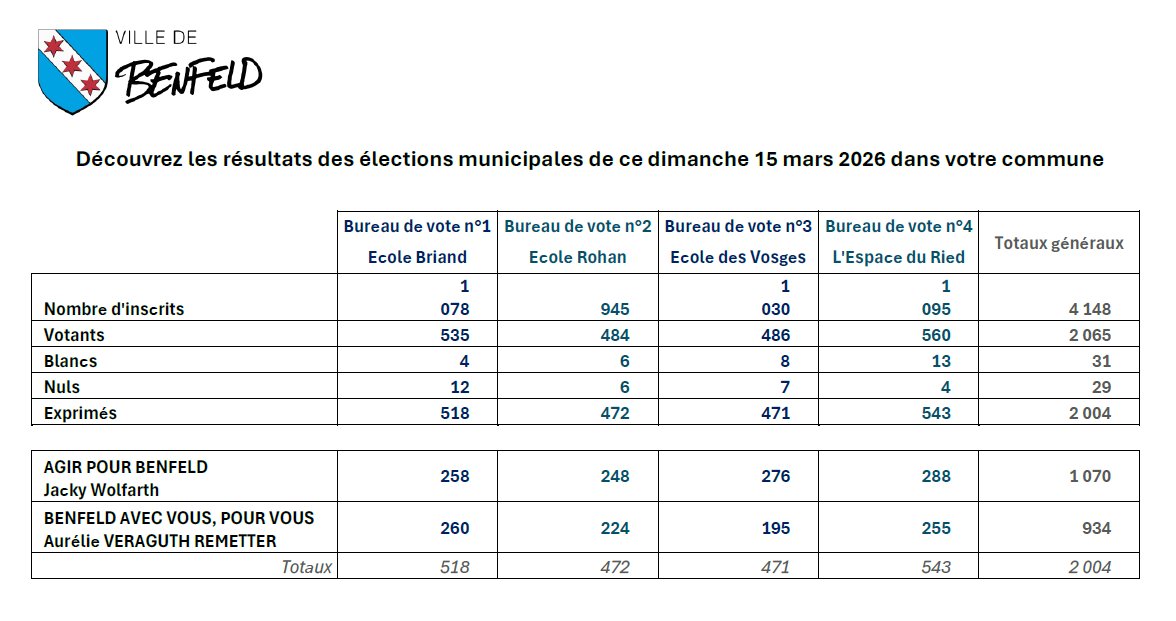 Veuillez trouver en pièce jointe les résultats détaillés des élections municipales du dimanche 15 mars 2026 pour la commune de BENFELD, par bureau de vote.