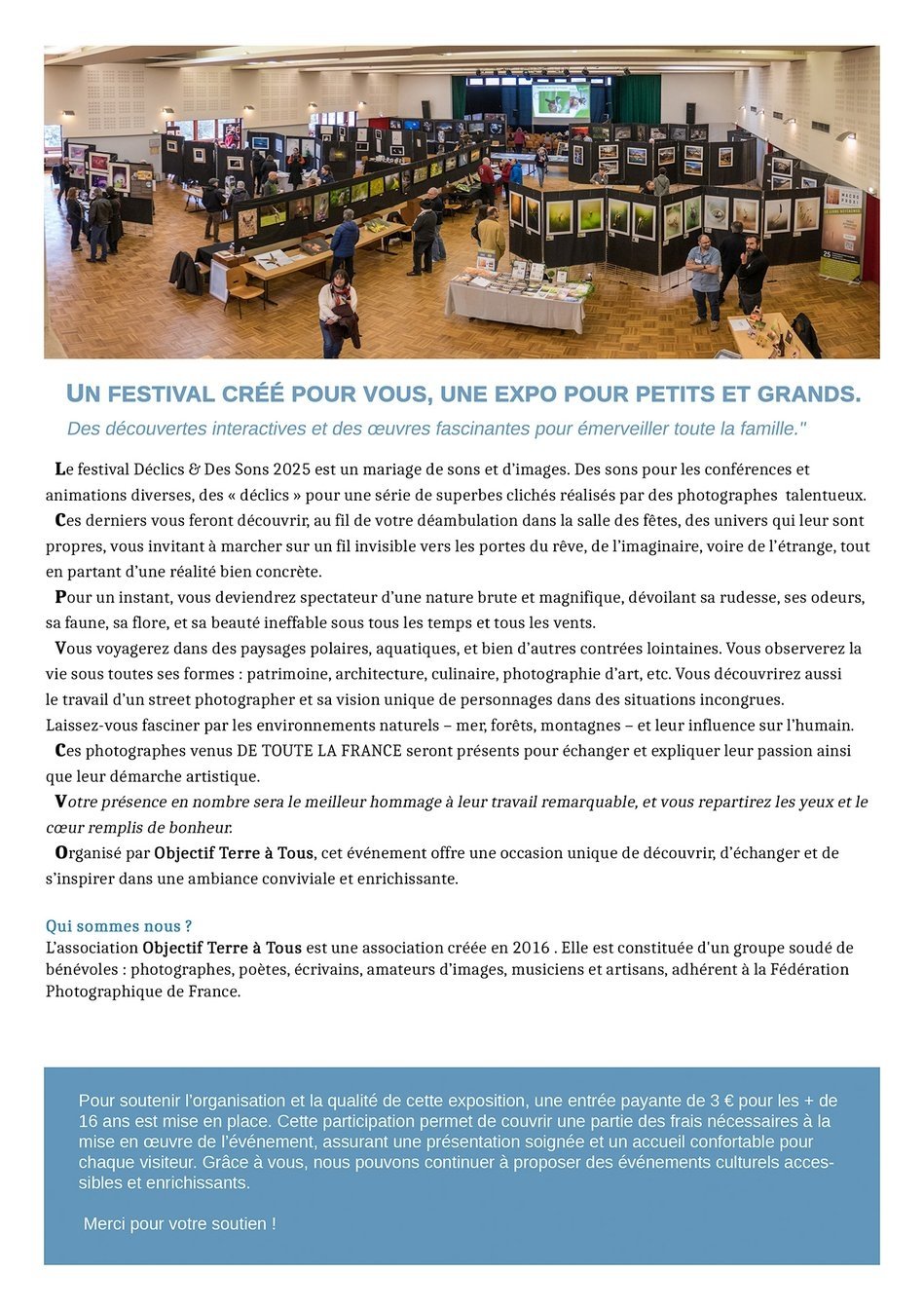 Porté par Benoît Koenig, photographe connu sous le nom de Ried Mann et président de l’association Objectif Terre à Tous (membre de la Fédération Photographique de France – UR21), Déclics & Des Sons invite petits et grands à s’émouvoir, s’interroger et s’émerveiller.